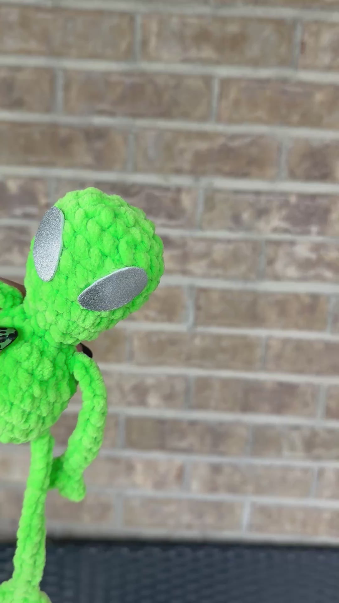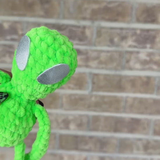 Crochet alien leggy buddy. Green alien plushie contains silver foam eyes that are glued on. Not for children ages 3 and under